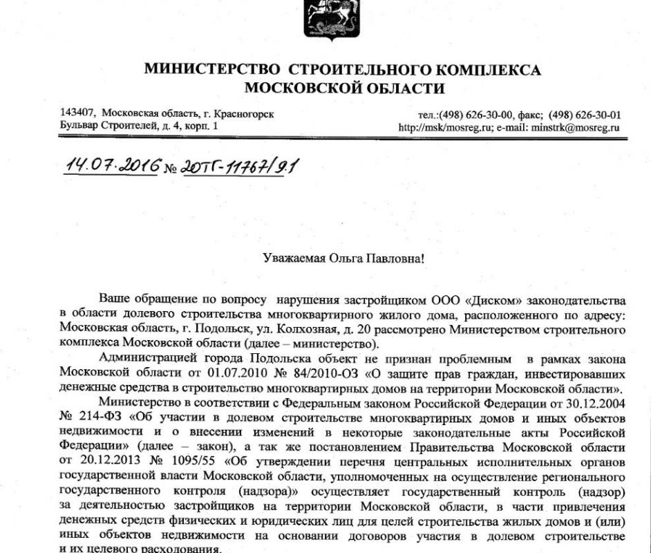 Добрый вечер всем! Была в отпуске и пропустила все события. Разрешите поделиться своими размышлениями. Посмотрела ответ Министерства строительного комплекса Московской области. В свете данного ответа напрашивается уточнение к ранее направленному запросу. В письме они указывают, что застройщик уведомил участников долевого строительства о переносе срока передачи объектов долевого строительства в соответствии с законодательством, но чем это подтверждено не указывает, то есть заявляет нам об этом голословно. Ни застройщик, ни Министерство не сообщили нам о причинах переноса сроков. Перенос сроков документально не обоснован. На сегодняшний день, мы не знаем (не выяснили) истинную причину затягивания сроков (несвоевременная поставка материалов, нехватка финансов и т.п.), нет об этом официальной информации, соответственно сроки окончания даже предположить сложно. Из Закона: "В соответствии с частью 1 статьи 6 Федерального закона от 30.12.2004 N 214-ФЗ "Об участии в долевом строительстве многоквартирных домов и иных объектов недвижимости и о внесении изменений в некоторые законодательные акты Российской Федерации" застройщик обязан передать участнику долевого строительства объект долевого строительства не позднее срока, предусмотренного договором.