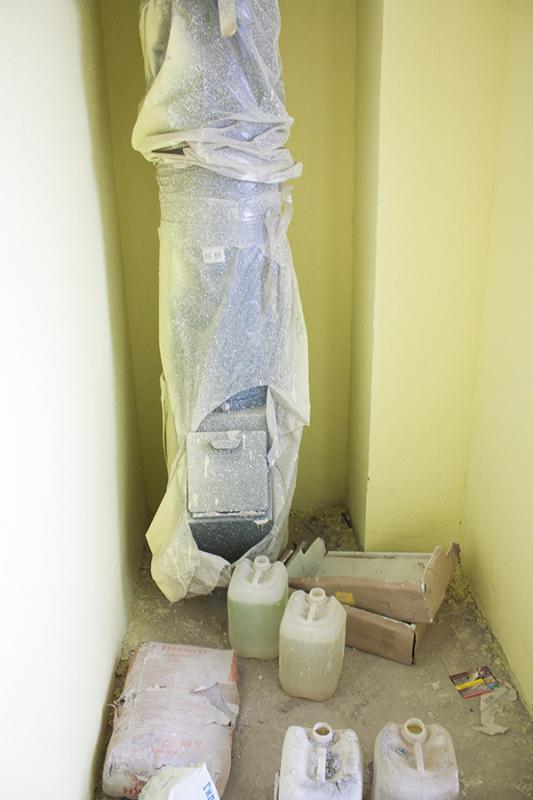 8. Мусоропроводу повезло больше всего. Он просто забрызган краской и уставлен канистрами, его настоящие "лицо" оберегает полиэтелен.