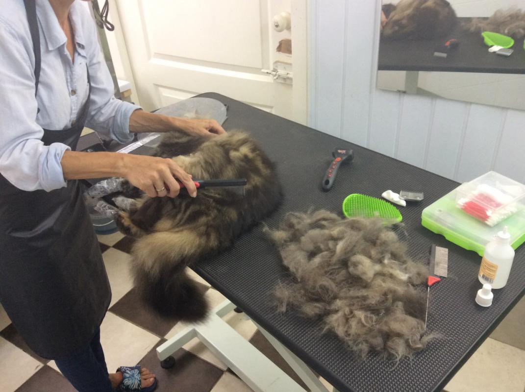 ("Пес и кот").31.07 приходил к нам приходил Мейн-кун Боня на вычесывание, вел себя хорошо, лежал спокойно и даже задремал, вычесали мы из него много шерсти всего за час работы, хозяйка не думала, что будет так много шерсти с её кота.