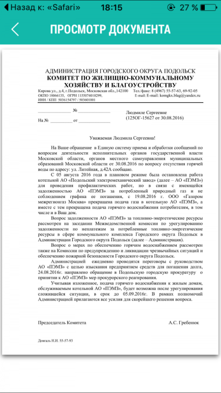 Вопрос о возобновлении горячего водоснабжения для потребителей котельных АО «ПЭМЗ» и ООО «Эврика-2», погашении задолженности предприятия перед ООО «Газпром межрегионгаз Москва» за потребленный газ незамедлительно был рассмотрен на Межведомственной комиссии администрации по урегулированию задолженности по неплатежам за потребленные топливно-энергетические ресурсы. Направлены обращения в Подольскую городскую прокуратуру о принятии мер прокурорского реагирования к АО «ПЭМЗ» и ООО «Эврика-2». О принимаемых мерах руководители АО «ПЭМЗ» и ООО «Эврика-2» доложили на Комиссии по предупреждению и ликвидации чрезвычайных ситуаций и обеспечению пожарной безопасности администрации Городского округа Подольск. Ежедневно проводятся переговоры с руководством АО «ПЭМЗ» и ООО «Эврика-2» с целью изыскания предприятиями средств для погашения долгов. В рамках полномочий, совместно с правоохранительными органами администрация Городского округа Подольск прилагает все усилия для скорейшего решения вопроса.
