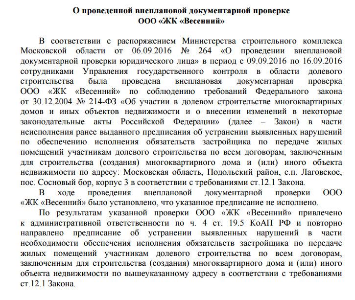 ч.4. Невыполнение в установленный срок законного предписания органа, осуществляющего региональный государственный контроль (надзор) в области долевого строительства многоквартирных домов и (или) иных объектов недвижимости, -