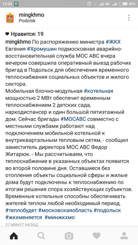 Прислали вчера в 23 часа.Администрация Городского округа Подольск ведет работу по возобновлению подачи теплоснабжения в микрорайоне «Шепчинки»