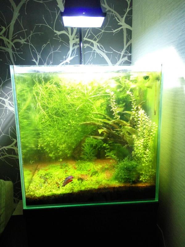 Добрый день. Продам свой кубик 125л с габаритами 50х50х50 см. на тумбе (цвет венге). Свет: маталлогалоген 70 вт. Внешник tetra ex 700. Грунт JBL Manado с питательной подложкой. Там же грунтовый нагреватель. В углу коряга. Отдам с мелочевкой (сифон, сачок, термометр), растючкой и живностью (хелены и вишни).