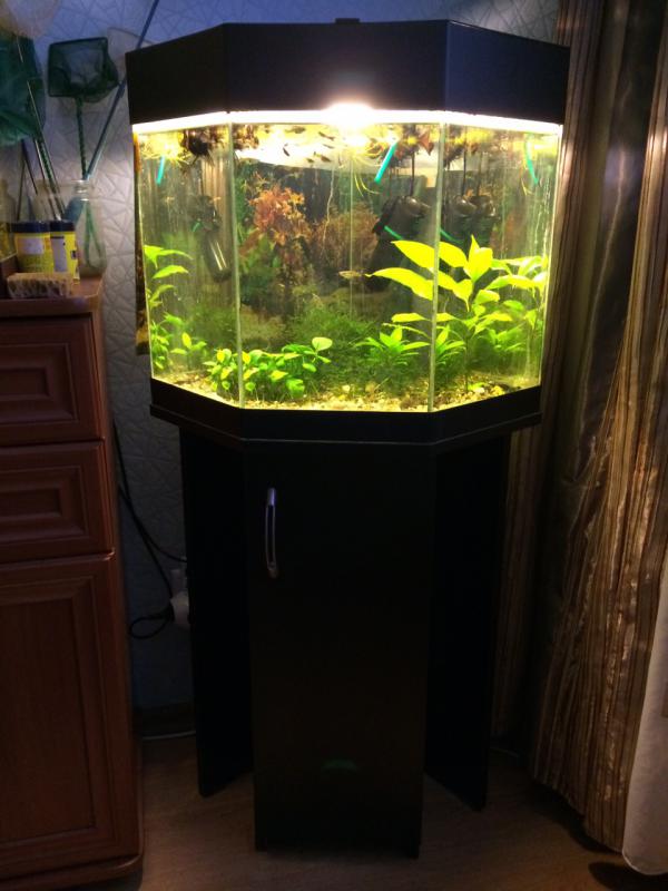 В связи с уменьшением количества аквариумов предлагаю угловой на 60 л, цвет черный, состояние банки хорошее, крышка плавленая в районе лампы, тумба угловая черная с дверкой, размер банки 40х40х46, цена с тумбой 8000 р., возможен разумный торг при осмотре.