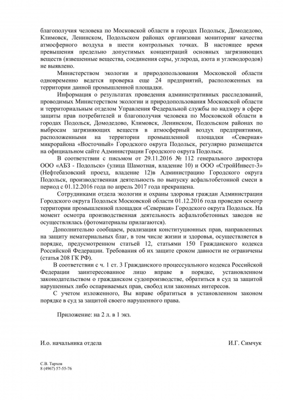 Территориальным отделом Роспотребнадзора проводится административное расследование по выбросам загрязняющих веществ в атмосферный воздух предприятиями, расположенными на территории северной промзоны Городского округа Подольск. Поводом послужили многочисленные обращения местных жителей, жаловавшихся на загрязнение воздуха в конце октября-начале ноября 2016г.