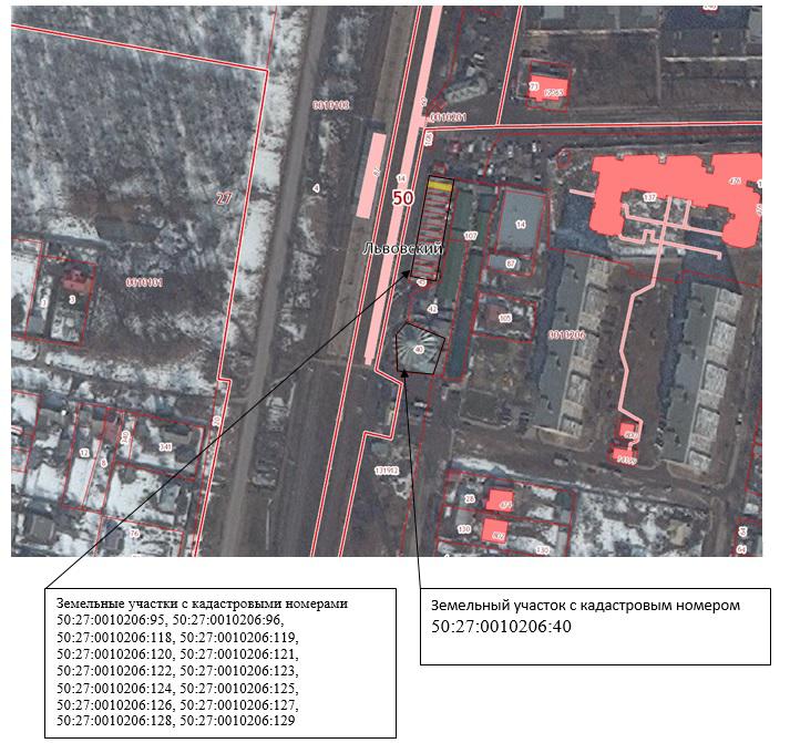 На основании состоявшихся 13.12.2016 публичных слушаний Комиссией по организации и проведению публичных слушаний принято решение одобрить установление вида разрешенного использования земельных участков с кадастровыми номерами: 50:27:0010206:95, 50:27:0010206:96, 50:27:0010206:118, 50:27:0010206:119, 50:27:0010206:120, 50:27:0010206:121, 50:27:0010206:122, 50:27:0010206:123, 50:27:0010206:124, 50:27:0010206:125, 50:27:0010206:126, 50:27:0010206:127, 50:27:0010206:128, 50:27:0010206:129, 50:27:0010206:40 площадью: 42 кв.м, 34 кв.м, 34 кв.м, 42 кв.м, 42 кв.м, 34 кв.м, 42 кв.м, 42 кв.м, 34 кв.м, 42 кв.м, 34 кв.м, 42 кв.м, 34 кв.м, 34 кв.м, 492 кв.м соответственно, расположенных по адресу: Московская область, р-н Подольский, с/пос. Львовский, рп. Львовский, категория земель «земли населенных пунктов», вид разрешенного использования «магазины».