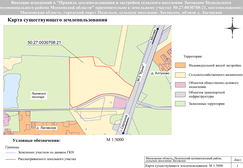 23 мая 2017 года в 15:00 по местоположению земельного участка с кадастровым номером 50:27:0030708:21, расположенному вблизи д. Лаговское Городского округа Подольск Московской области (схема прилагается), состоятся публичные слушания по вопросу внесения изменений в «Правила землепользования и застройки сельского поселения Лаговское Подольского муниципального района Московской области» применительно к земельному участку с кадастровым номером 50:27:0030708:21, расположенному вблизи д. Лаговское Городского округа Подольск Московской области.