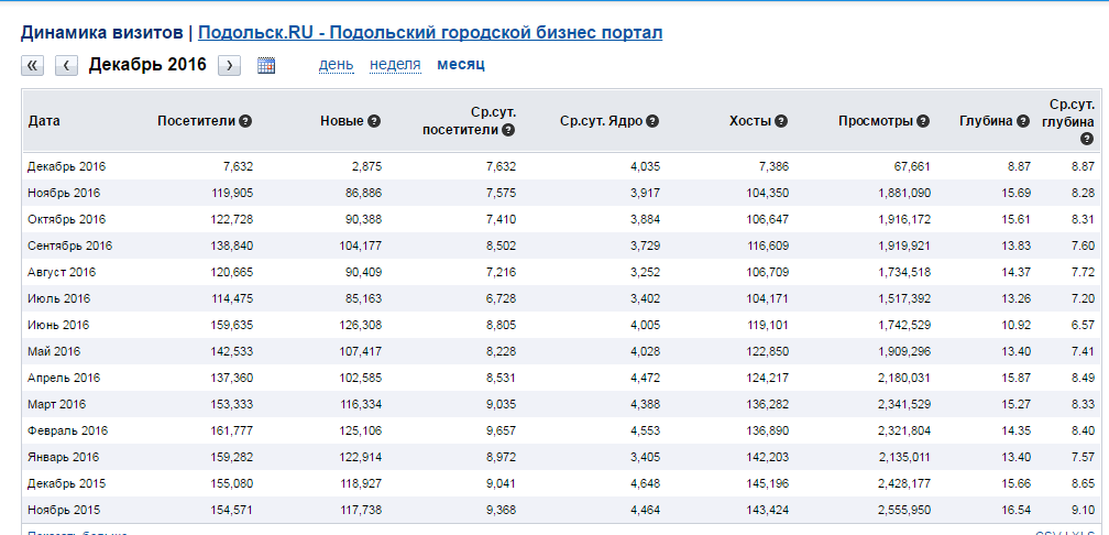 Динамика визитов на сайты ТВК, МУП "Медиацентр" и Подольск.ру (сколько уникальных посетителей в месяц).