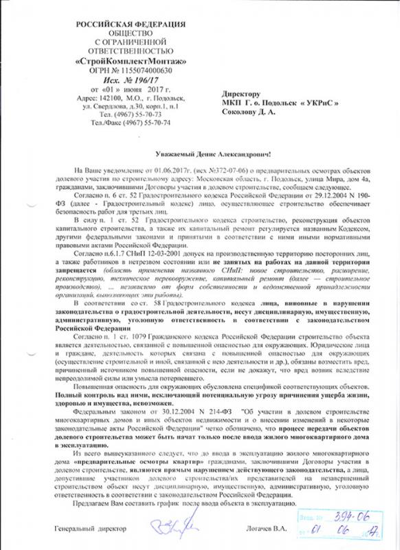 Написал про неоднократный перенос сроков, про медленные темпы строительства, про игнорирование УКРиС наших вопросов к ним. Про то, что разрешения (официального!) на перенос сроков строительства Нет, а нам прислали в очередной раз уведомление. и т.д.