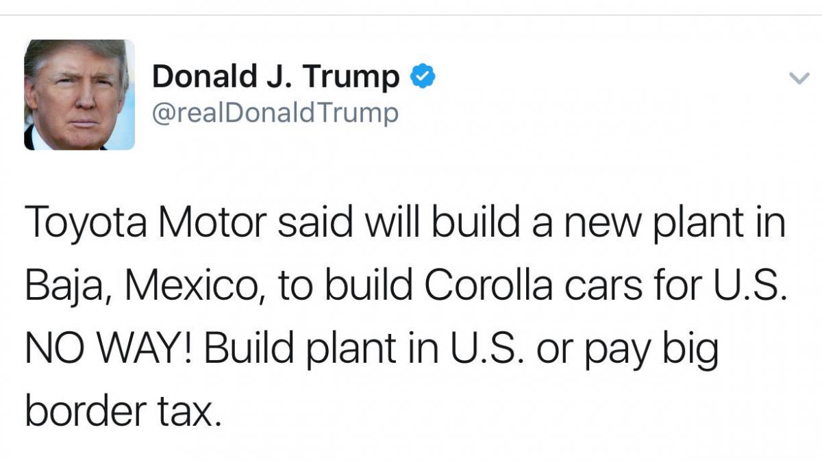 Акции Тойоты упали после того, как Трамп наехал на них в Твиттере и потребовал начать производство Короллы не в Мексике, а в США