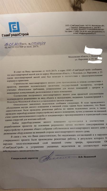 Всем добрый вечер. Хочется поделиться проблемой. Мы проживаем на последнем этаже, первая очередь.Одно из помещений, у нас эркер. Так вот проблема такая, при подписании актов были заданы вопросы, по поводу промерзания эркеров. На что получили утвердительный ответ, что все по проекту предусмотрено, и промерзание полностью исключено.Но по проживанию 1,5 лет выяснилось, что все их обещания оказались полным обманом. При температуре -10 ступить на пол босяком в зоне эркера невозможно, ноги просто мерзнут. Написали в Главградострой жалобу, они прислали рабочих, что бы утеплить монолитное перекрытие, между этажами, на выступающей части эркера. Пояснив , что после этих мер все будет хорошо. Но как оказалось, все это полная туфта. Пол как был холодным, так и остался. Мы написали им новую жалобу. На днях получили от них ответ, что у них все построено по проекту, а мы сами виноваты в том что у нас мерзнет пол, так как мы без согласования установили себе кондиционер, что повлекло за собой нарушение и повреждение тепло-изоляционного слоя внешний стены. Из за чего у нас и возникает такая проблема.( позже я выложу все письмо). У меня возник только один вопрос, какое "тепло-изоляционный слоя внешний стены" я нарушил? Я во время строительства этого дома проживал в доме напротив, что дало мне возможность ежедневно наблюдать за ходом строительства. И на всем этапе стройки, я ни разу не видел, что бы они при кладке наружных стен, укладывали тепло-изоляционный слой. У них глядя и на продолжение строительства дома видно, что они укладывают два ряда газоблоков и облицовочный кирпич. И ни какой тепло-изоляции там и в помине нет.Вообщем хочу предостеречь, тех покупателей, которые приобретают у этого застройщика квартиры с эркером., при приемки квартир по акту, проверять температура пола, и стен. И только после этого получать ключи.Вообщем не смотря на все положительные рекомендации об этом застройщике, он меня разочаровал.
