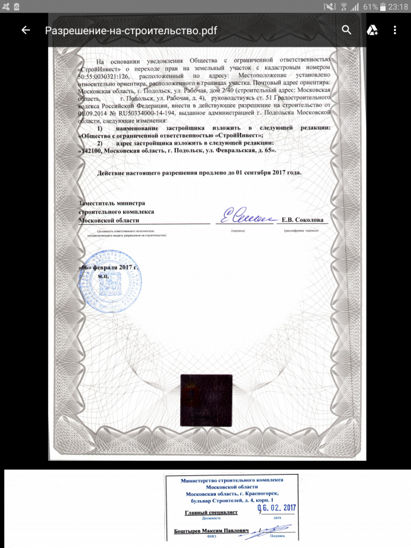 Здравствуйте, соседи!!! Вчера отыскал контакт директора СтройИнвеста и поговорил с ним,т.к. у менеджера из каскада ничего толком не добился. Спросил про то что делается и когда все доделается. Вообщем разрешение на строительство продлили до Сентября месяца, но сдать планируют в июле. Сейчас, в связи с тем что морозы, работы медленно идут, но делают внутри проводку и по отоплению, планируют в марте подвести отопление и электричество. Лифты закупили, я лично видел их на территории стройки, и собираются устанавливать после подключения электричества. Если бы стройку заморозили, не закупили бы лифты это точно. Как потеплеет будут заниматься благоустройством прилегающей территории и доделывать фасады и остекление лоджий. Поговорив с ним у меня сложилось хорошее впечатление, и я поверил его словам. А главное успокоился. Потому что сам был в панике от невединея. Тем более сам два раза в день прохожу дом и вижу что делают или нет. Вообщем, всем терпения и ожидания благополучной сдачи дома!!!!