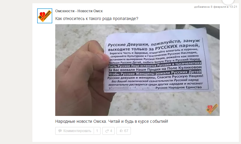Портал "Подмосковье сегодня" с чьей-то подачи написал вчера: "В подмосковном Подольске раздают листовки с призывом к русским девушкам выходить замуж только за русских