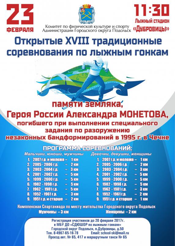 Открытые XVIII традиционные соревнования по лыжным гонкам памяти героя России Александра Монетова состоятся 23 февраля в 12.00 на лыжной трассе СДЮШОР.