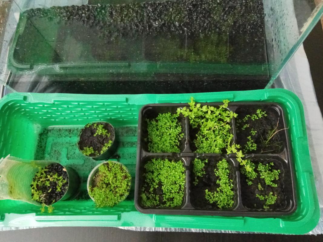 Состав на фото. Та куба которую высадил в аквариум росла на той же почве в тепличке (контейнер для рассады из Леруа Мерлен с комплекными стаканчиками)