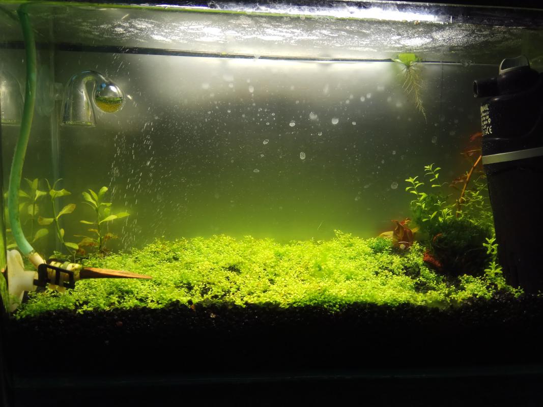 Да как то все по прежнему. Смысла выкладывать нет. Цвет вывожу подменами. Каждые 2 дня процентов по 50. Куба пошла в рост и пузыряет. В уголке хемиантус микрантемоидес тоже потихоньку распушается. Дую от души СО2. Заменил китайский диффузор на веточку. Все весело пузыряет