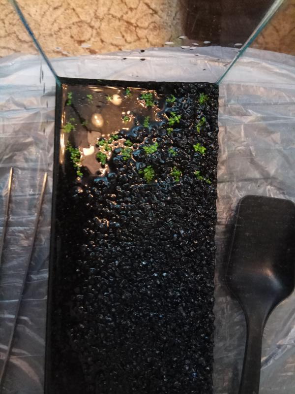 Состав на фото. Та куба которую высадил в аквариум росла на той же почве в тепличке (контейнер для рассады из Леруа Мерлен с комплекными стаканчиками)