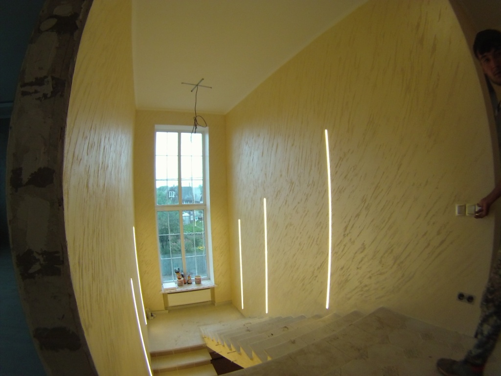 Первый этап - прокладка проводов в гофротрубе по полам, по потолкам, по стенам, штробление. Также прокладываются телевизионные провода и интернет. Далее монтируется несколько розеток и временное освещение для строителей.