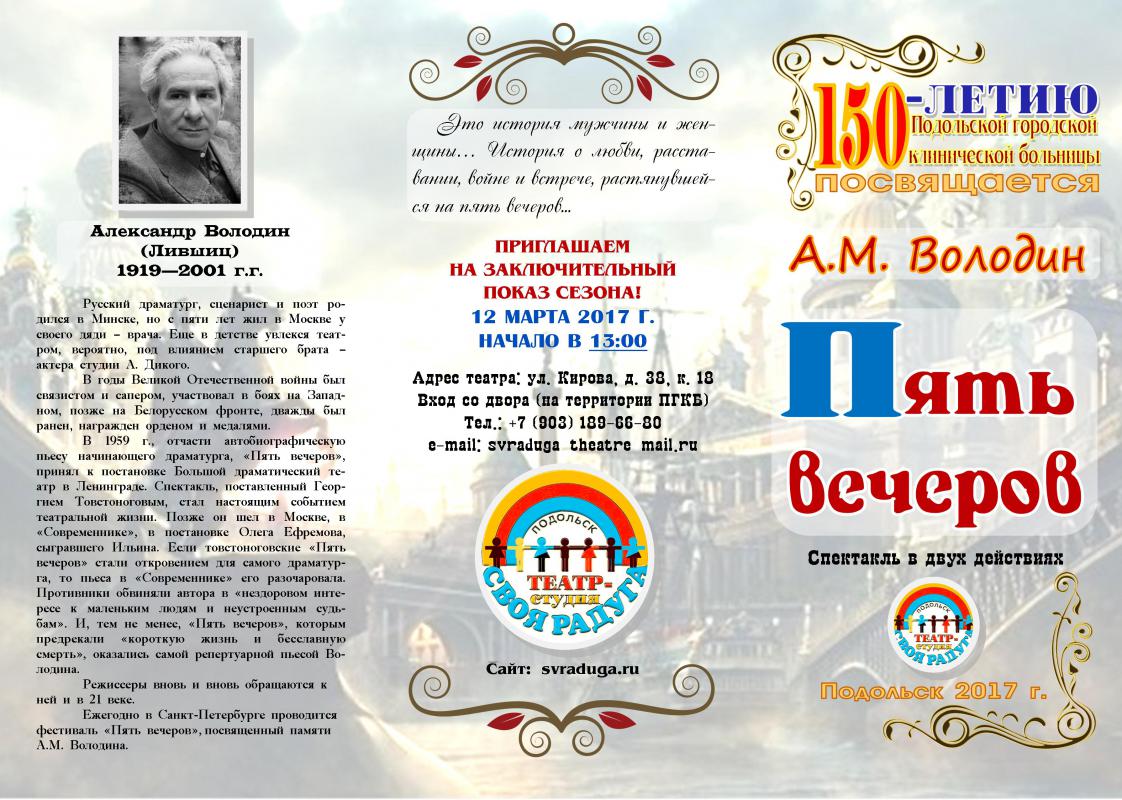 Театр-студия "СВОЯ РАДУГА" приглашает всех желающих на спектакль "Пять вечеров" по пьесе знаменитого драматурга А.Володина.