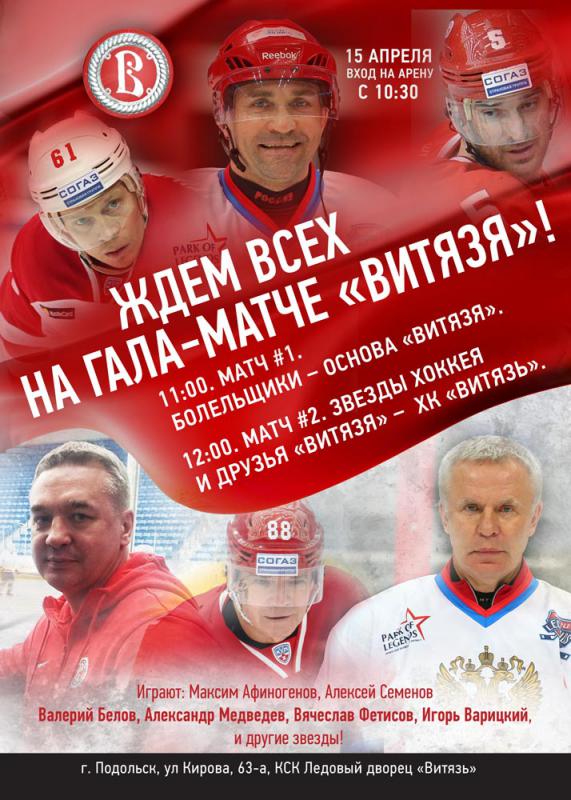 В субботу, 15 апреля, в Ледовом дворце «Витязь» (Подольск, ул. Кирова, 63а) пройдет гала-матч, на котором сначала в 11.00 встретятся болельщики и главная команда «Витязя». Затем в 12.00 на лед выйдут звезды и друзья «Витязя» во главе с Александром Медведевым, а также Валерий Белов, Игорь Варицкий, Равиль Якубов, Андрей Сапожников, Лев Бердичевский, Максим Бец, Рустем Камалетдинов, Андрей Коваленко, Станислав Ярушин, Александр Гуськов.