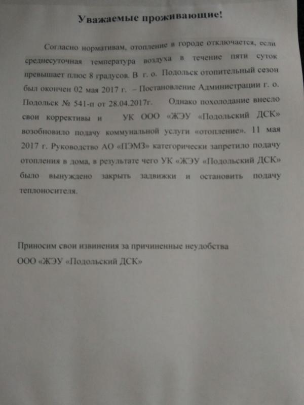 ANKA.ru писал(а):В Большом Подольске с 11 мая возобновляется подача тепла.