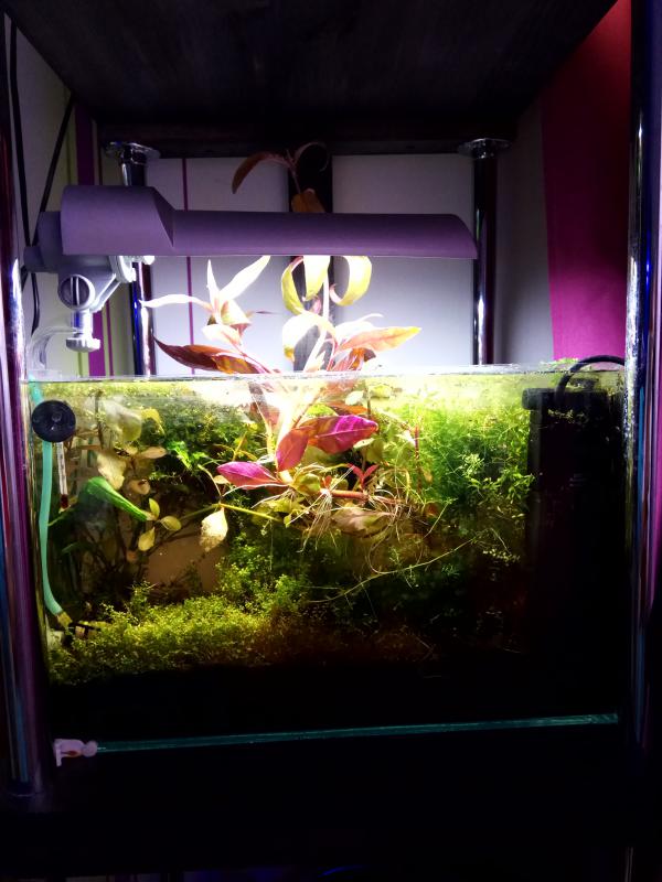 От жителей был замечен небольшой акт суицида в фильтре акваэль фан2. Но вовремя был пресечен и обошлись минимальными жертвами. Заменил фильтр на доставшийся по случаю dennerle от 30 литрового кубика. В него залезть значительно сложнее. Вот что имеем на данный момент