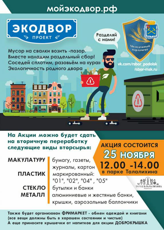 Впервые в нашем родном городе состоится акция "ЭКОДВОР" посвященная экологическому просвещению и приему раздельно собранных отходов от граждан! Акция состоится при поддержке Молодежного Парламента г.Подольска.