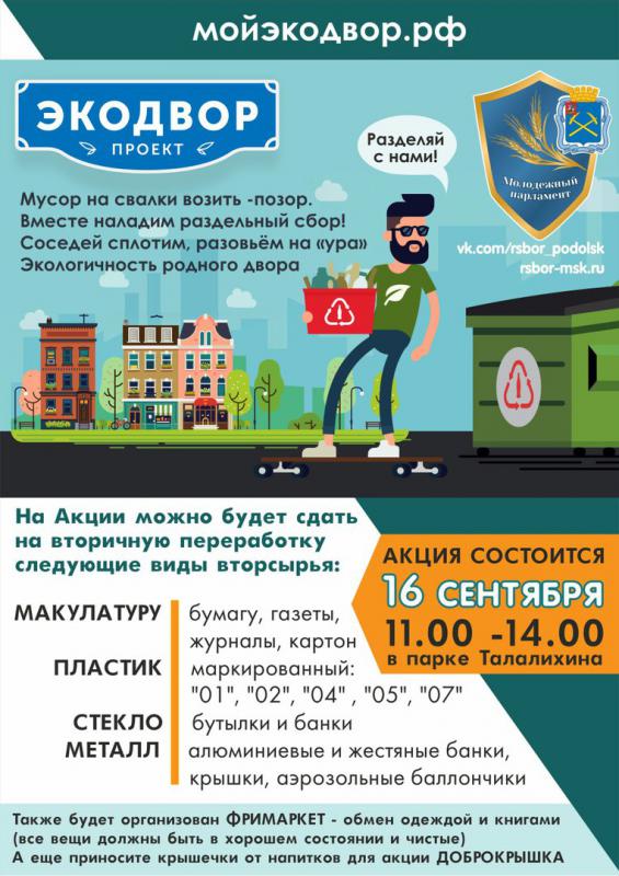 Впервые в нашем родном городе состоится акция "ЭКОДВОР" посвященная экологическому просвещению и приему раздельно собранных отходов от граждан! Акция состоится при поддержке Молодежного Парламента г.Подольска.