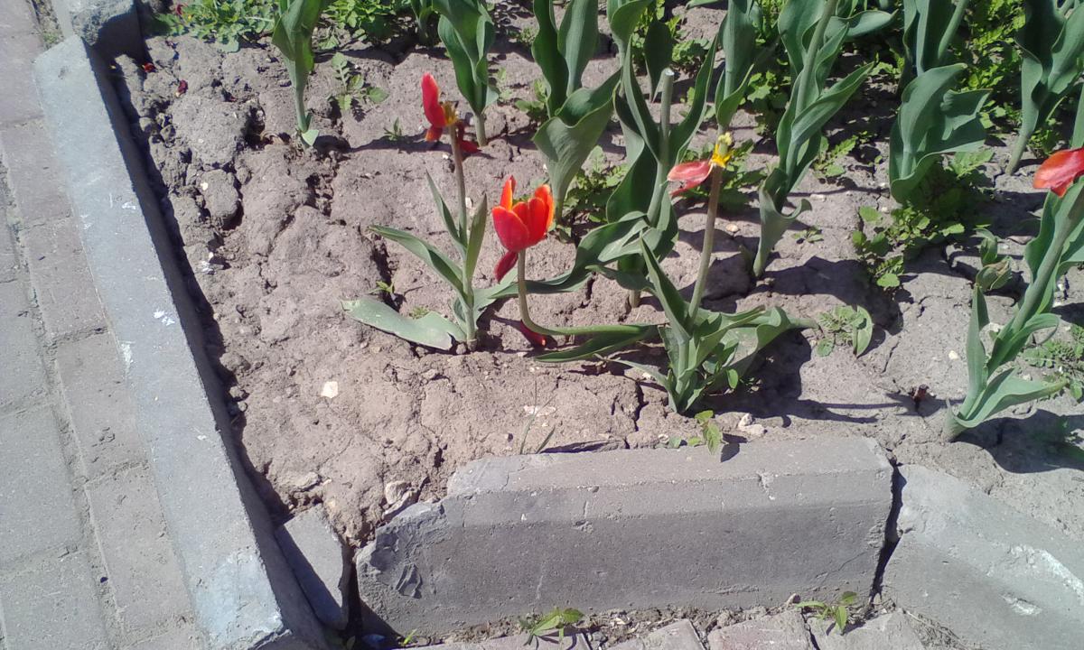 В мае в твердокаменную землю на месте бывших сугробов с реагентами посадили кустики.