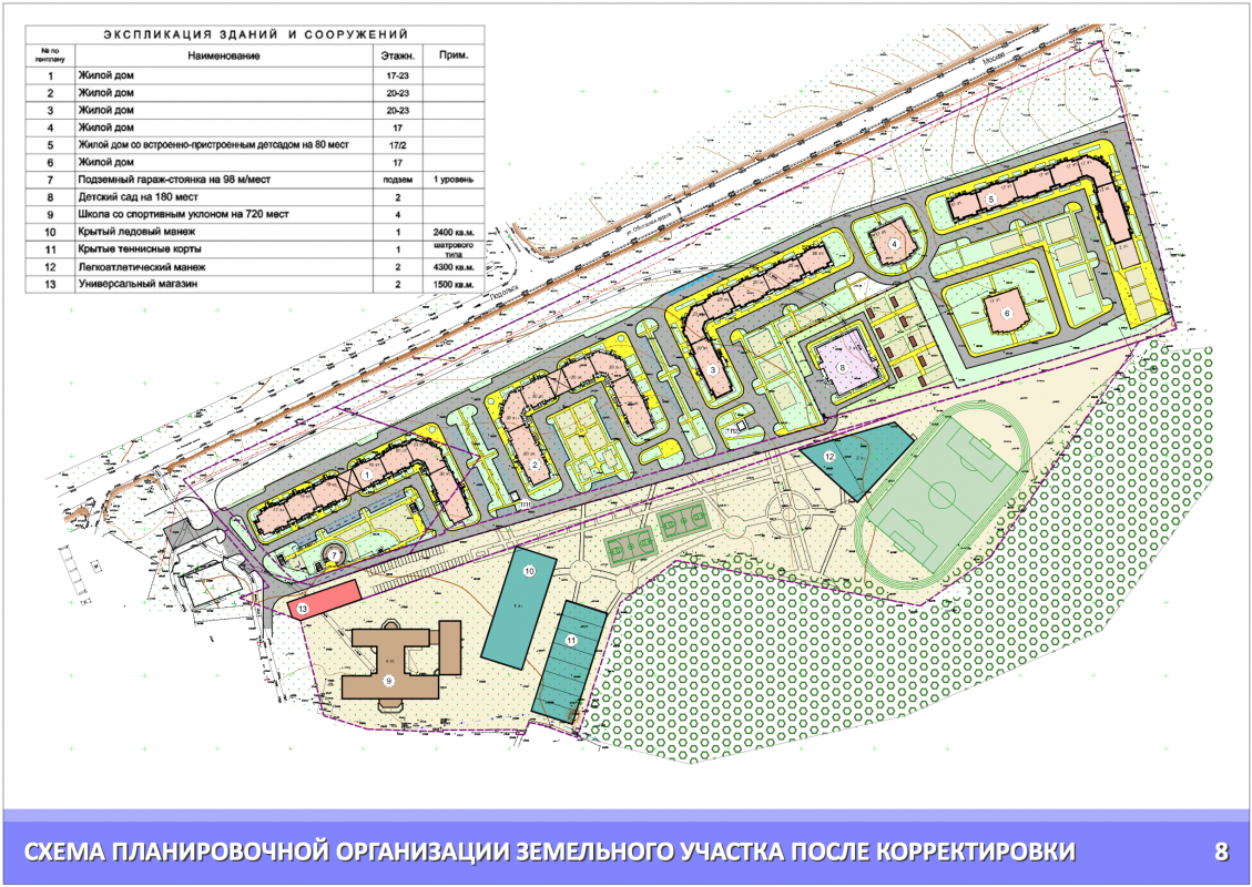 Для школы земельный участок недостаточен, планировка территории тоже. К школе по нормативам должен прилегать открытый спортивный стадион на одной общей со школой закрытой территории. Может, проектировщик подразумевает, что стадион у "легкоатлетического манежа" подойдёт, но они не на одной территории и разнесены. По правилам это не допускается.