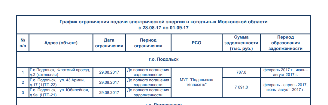 В связи со значительной просроченной задолженностью за потребленную электрическую энергию, ПАО « Мосэнергосбыт» вводит ограничение режима потребления электрической энергии следующих объектов МУП « Подольская теплосеть»:
