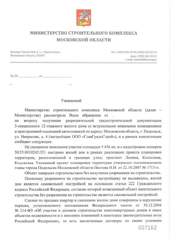 Письмо скорей не липовое, потому что я на свой запрос в министерство получила аналогичный ответ. Знакомая из стройнадзора сказала, что это обычная практика, все в 99% случаев решается через суд, вопрос времени и готовности к этому суду ГГС. Сотрудница ГГС тоже говорила, что если не получится оформить разрешение (а видимо уже и не получится), то будет суд, самый оптимистичный прогноз - 3 месяца... А по стройке: пропала каска, которая висела на въезде в паркинг месяца 2) вот и все изменения...((