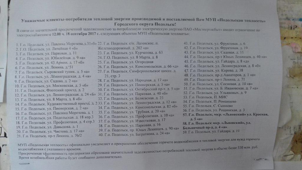 В связи со значительной просроченной задолженностью за потребленную электрическую энергию ПАО «Мосэнергосбыт» вводит ограничение по электроснабжению с 12.00 ч. 14 сентября 2017 г. следующих объектов МУП «Подольская теплосеть»: