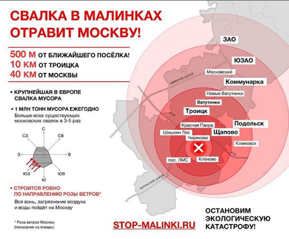 Интересно девки пляшут. Роза ветров у них странная - обычно с СЗ-З на ЮВ-В. И даже если так, то почему на схеме круглые зоны - должны быть в форме лепестков. И как полигон в 40 км от Москвы ей навредит? Санитарная зона от мусорных заводов или угольных станций - 1 км. Ну, ок, до 5 км может при аварии что-то долететь, но 10-40...