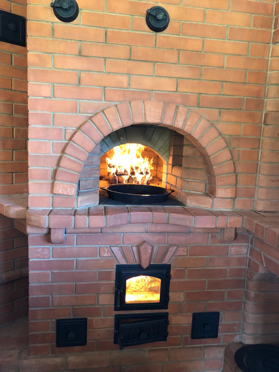 Первое это топка с духовкой –хлебной камерой. Принцип ее устройства и работы следующие. Над топкой расположена духовая камера,которая отделена от топки щелевым сводом, в момент горения дров в топке пламя истекает в камеру прокаливая ее. Для ее обустройства необходима ширина от фундамента комплекса всего 75-80 см.