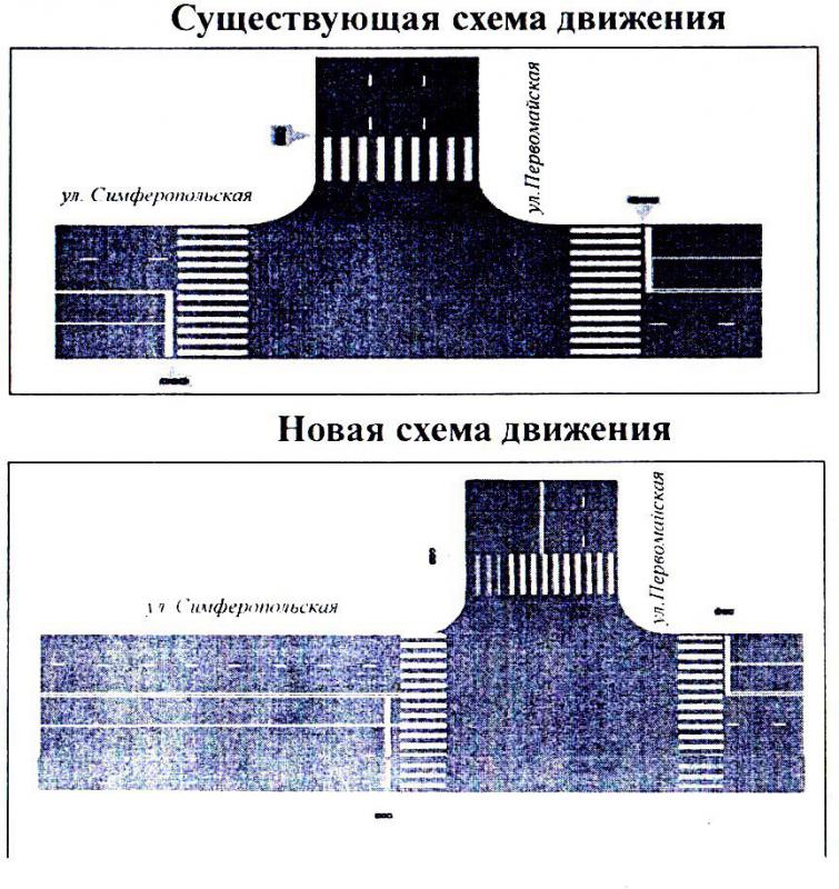 3. Устройство дополнительной полосы на Старосимферопольском шоссе в районе пересечения с ул. Первомайской, для движения в прямом направлении и дополнительной правоповоротной полосы на ул. Первомайской при выезде на Старосимферопольское шоссе;
