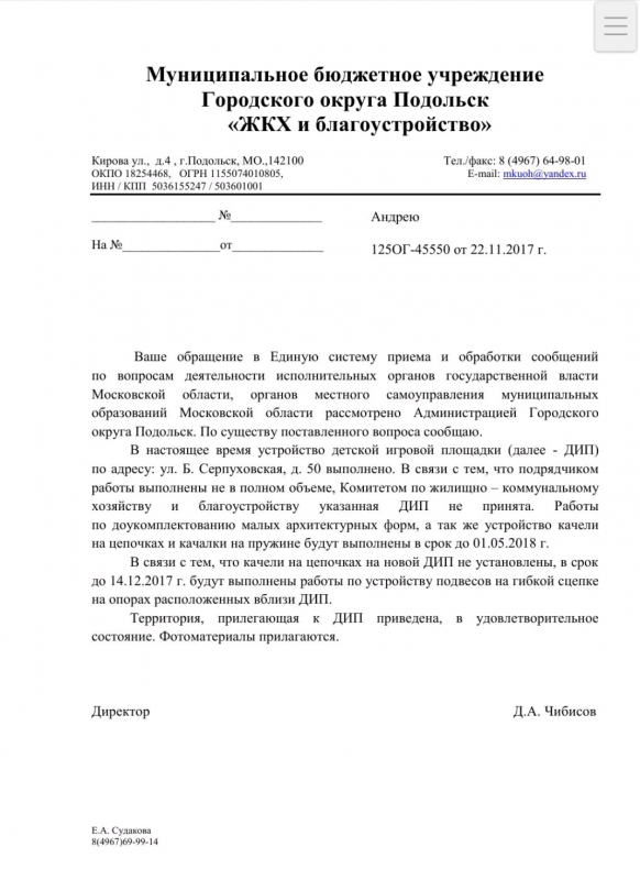 В г. Подольск, ул. Правды, дом 19/2 в мае 2017 г. была заложена детская площадка. Строительство площадки длилось до конца октября. Но к удивлению жителей площадку не достроили. На многочисленные жалобы жителей МЖРП повесило объявление о том, что площадка сдана, но мелкий ремонт может проводиться до 10 мая 2018г. Во избежание травм рекомендовалось не пускать детей на площадку. Рядом с площадкой находится детский сад №62 и школа №4. Многие дети получили травмы.