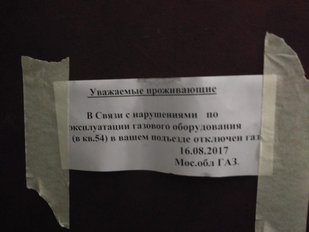 http://www.podolsk.ru/proisshestviya_v_ ... 27917.html15 июля в 19.00 по адресу: Московская область, г. о. Подольск, ул. Быковская, д. 20, 1-й подъезд, квартиры с 1 по 8, произошло аварийное отключение газа (залили воду во внутренний газопровод).