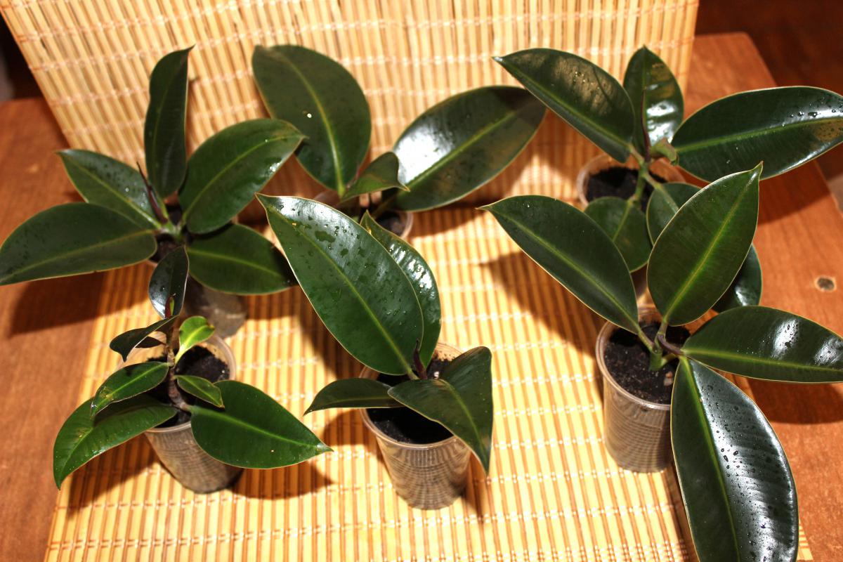 Малыши - фикусы были рассажены отдельно. Фотоаппарат дают некую "серость", но пыли на листиках нет, вполне себе обычные фикусы по цвету.