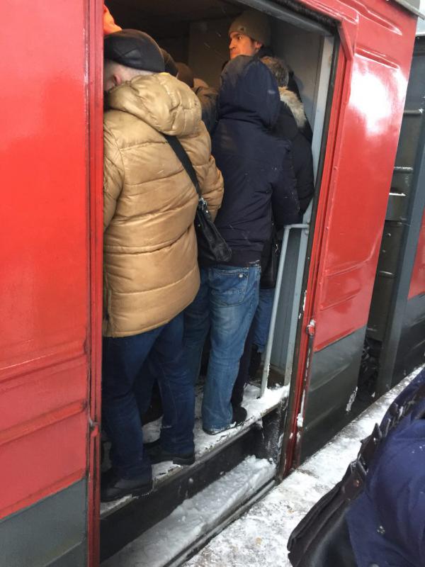 Чего-то ад сегодня. С Силикатной так и не смог влезть в эти скотовозки в течение часа, развернулся да поехал в пробках стоять, в машине хоть тепло. Почему они зная, что из-за снегопада будет огромный трафик людей, не увеличивают количество электричек? facepalm:
