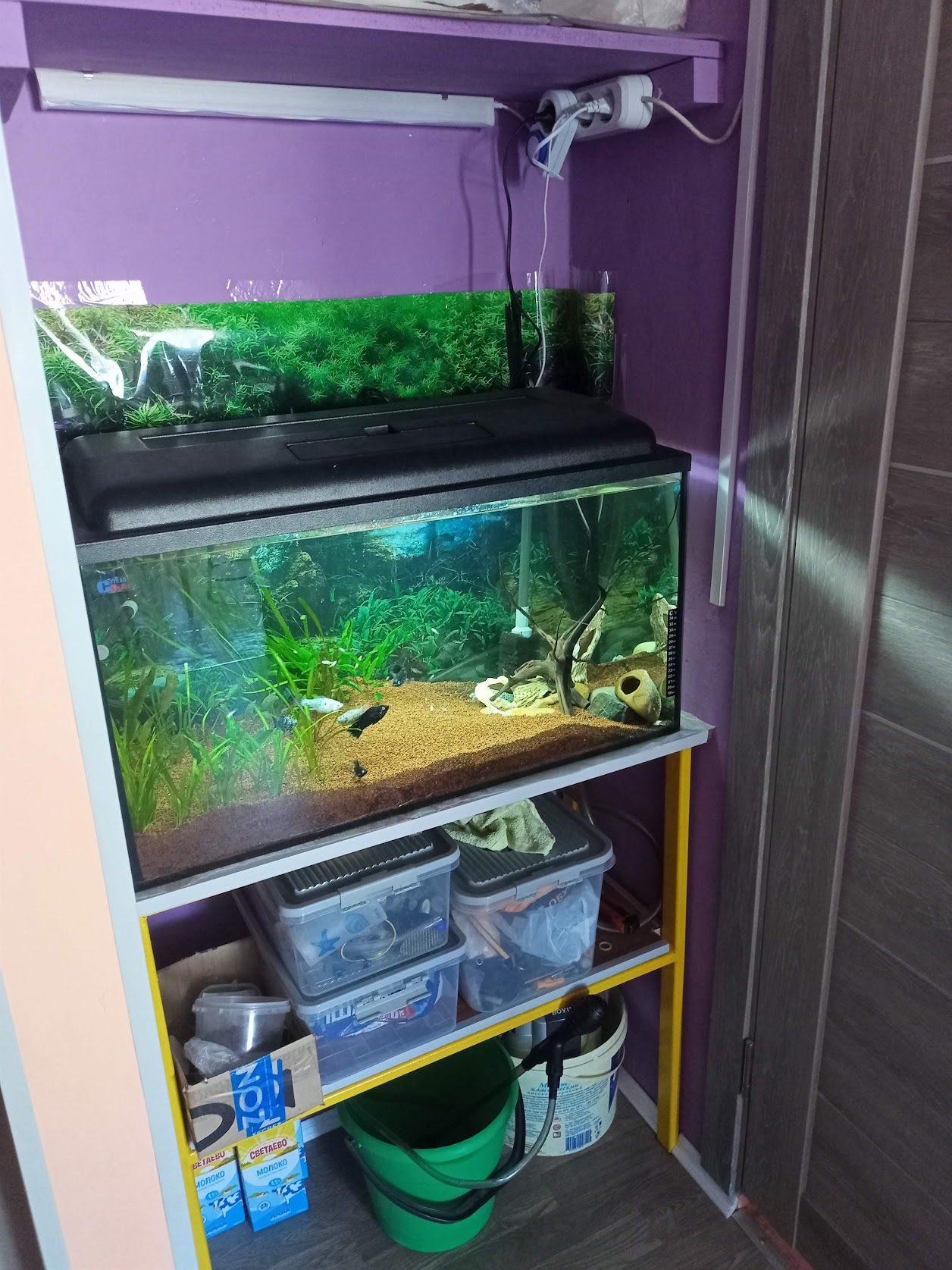 По началу был фильтр SunSun 603 - он не справился, приобрел у аквариумиста на Октябрьском BOYU, были гуппи, расплодились до жути, видимо для них слишком хорошие условия, пришлось выводить их всех.