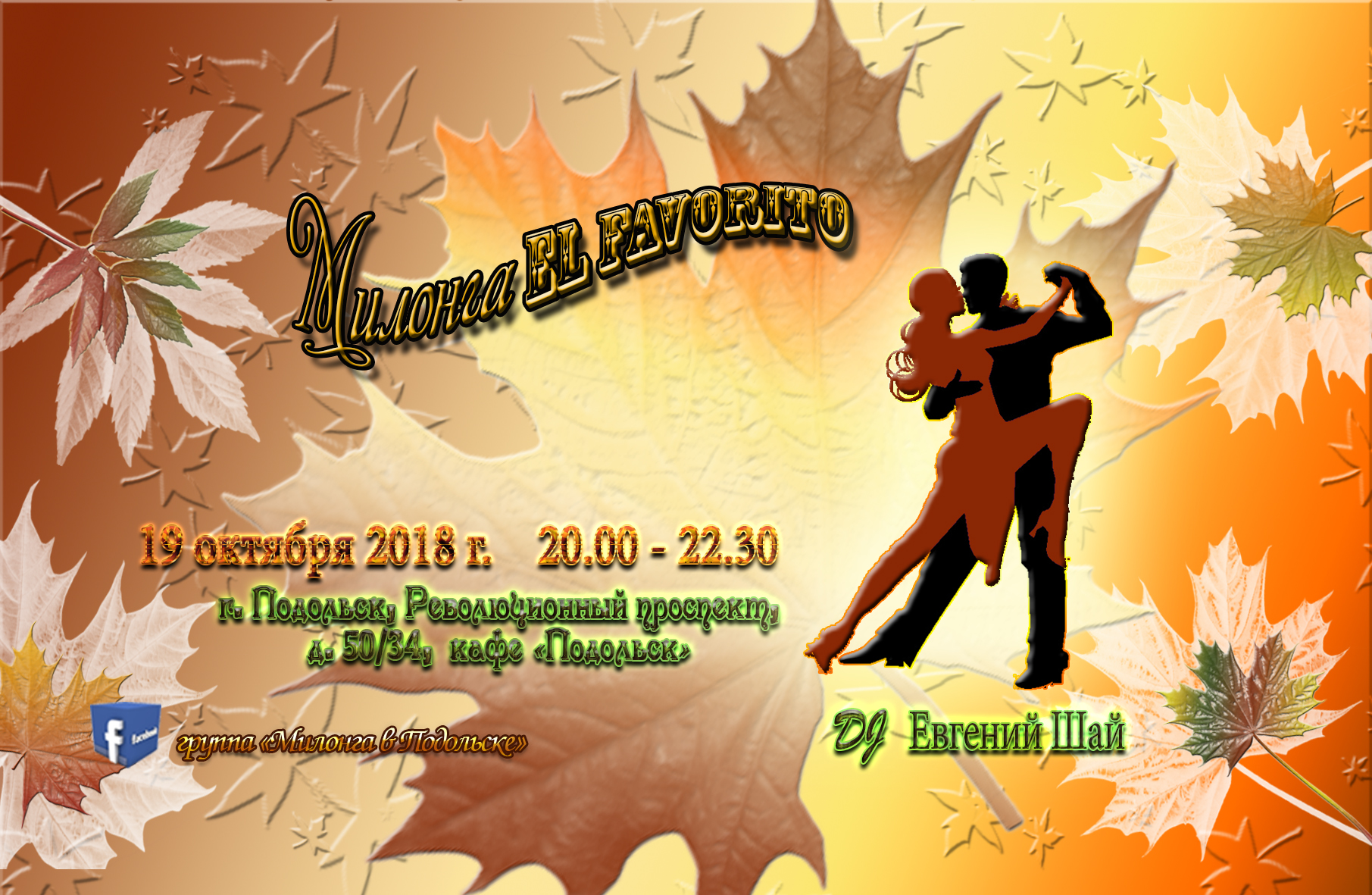 Приходите согреться в объятьях жаркого танго на нашу милонгу уходящей осени 30 ноября 2018 г. Танцуем с 20.00 до 22.30! Место проведения - кафе «Подольск». Адрес: Московская область, г. Подольск, Революционный проспект, 50/34 (нижний зал). Элегантный внешний вид и сменная обувь будут вашим несомненным преимуществом. Организационный взнос: 250 руб. с танцующего в коробочку-копилку у диджейского пульта.