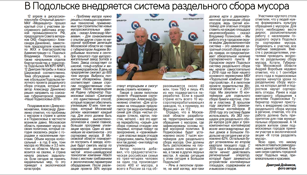 https://www.youtube.com/watch?v=O_K3XcXz23MПроект «Диалог с жителями Городского округа Подольск о внедрении пилотного проекта раздельного сбора отходов» решил направить на соискание губернаторской премии «Наше Подмосковье» председатель Совета ветеранов КБ «Гидропресс» Александр Матвеевич Даниленко