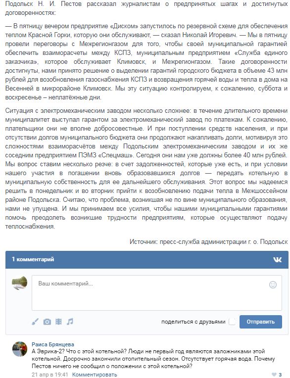 Причиной остановки указанных котельных стало прекращение подачи газа теплоснабжающим предприятиям. Администрация Городского округа Подольск осуществляет взаимодействие с ООО «Газпром Межрегионгаз Москва» в целях решения вопроса о возобновлении подачи отопления и горячего водоснабжения жителям. В субботу, 21 апреля, глава городского округа Подольск Н. И. Пестов рассказал журналистам о предпринятых шагах и достигнутых договоренностях: