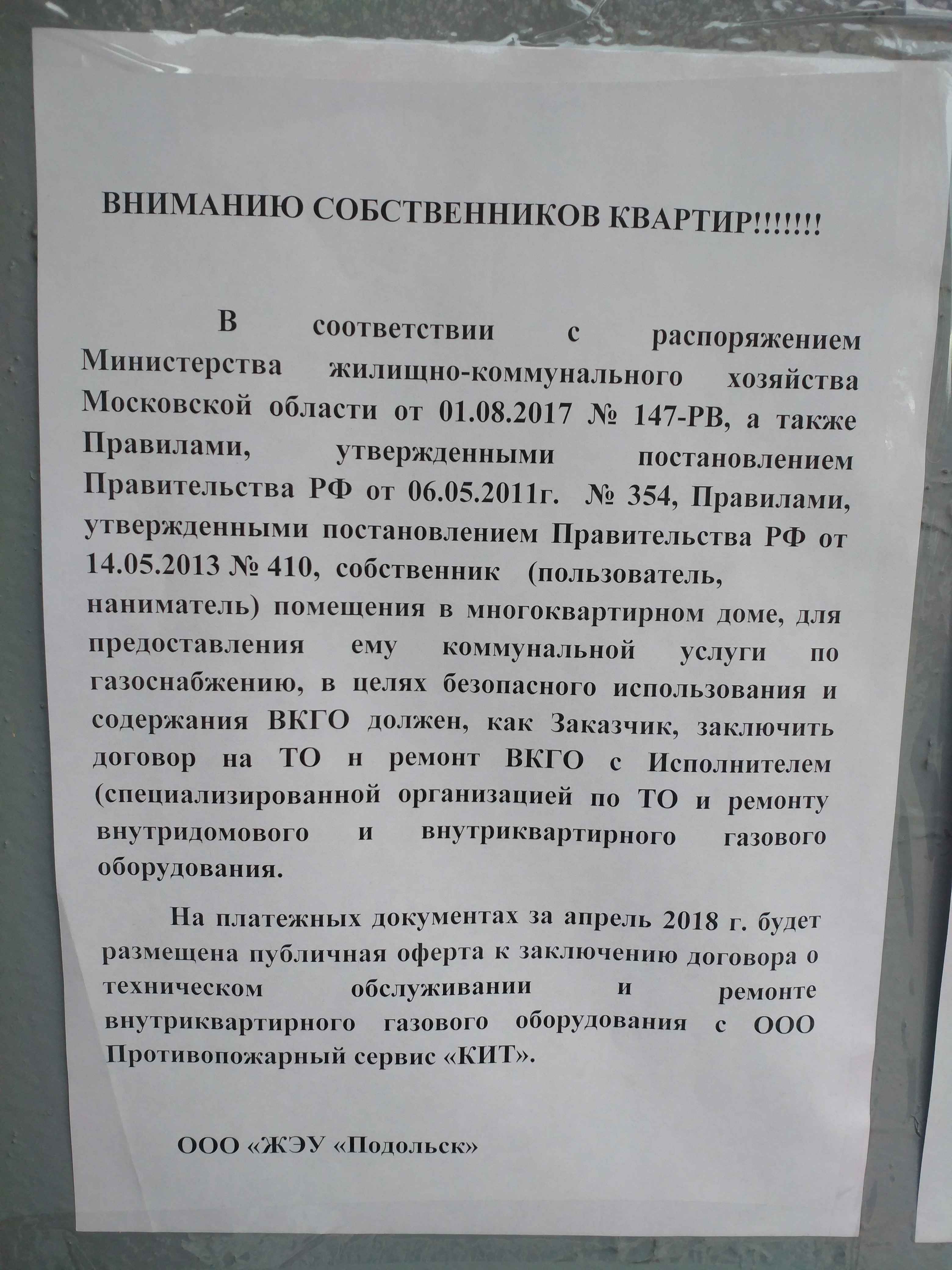 Горячо любимое правительство на фоне взрывов бытового газа решило, что собственники должны в обязательном порядке платить полторы тыщи в год за намыливание газовой трубы раз в год содержание отвода от газового стояка и кухонной плиты. А для тех, кто будет уклоняться от заключения договора (а договор собственник заключить ОБЯЗАН) даже придумали административный штраф и возможность отключения услуги газоснабжения.