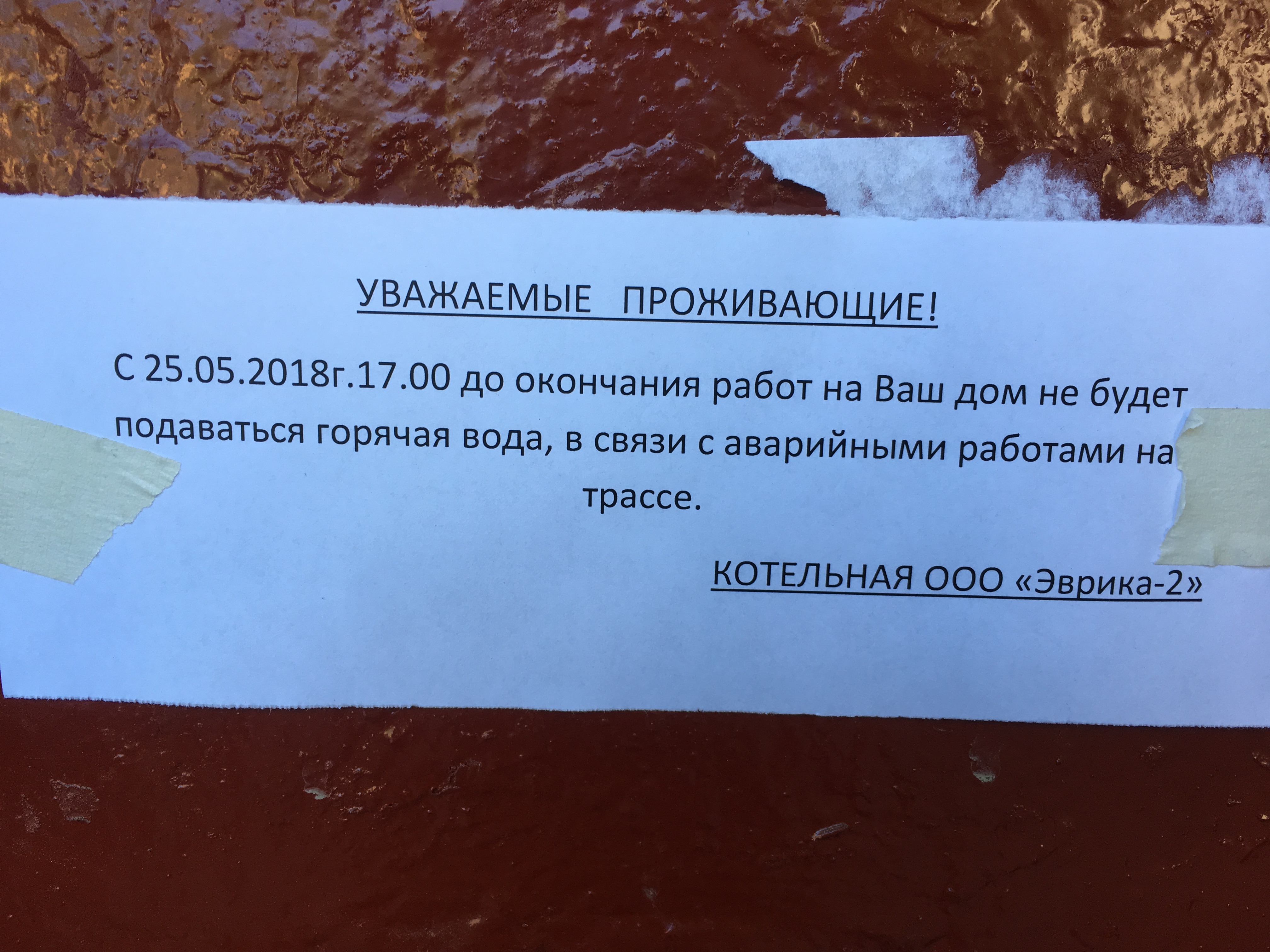 По ул. Вокзальная (котельная Эврика-2) в пятницу после опрессовки отключили горячую воду; сегодня на несколько часов дали и вновь отключили. Звонила в субботу в диспетчерскую МУЖРП-1- на трассе Эврики-2 авария - неизвестно на сколько отключили; в ПОНЕДЕЛЬНИК начнут работы. То есть в выходные все "заслуженно" отдыхают.