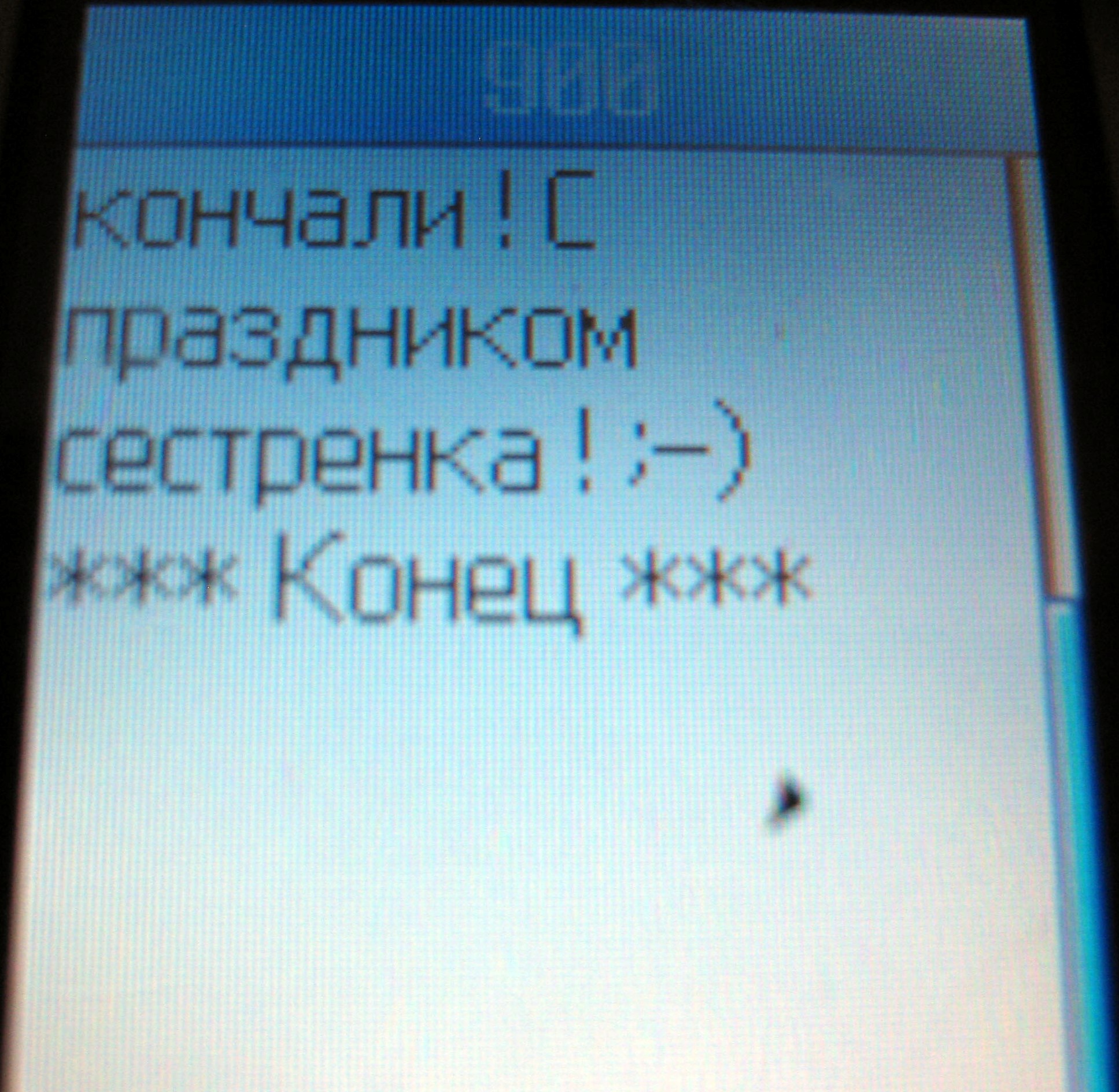 Включил старый самсунговский телефон-раскладушку жены, который больше года валялся в ящике. По причине глючности. в виду преклонного возраста, был заменен на новый. Видать мозги у него совсем переклинило и смс-ку годичной давности он прочитал по своему.