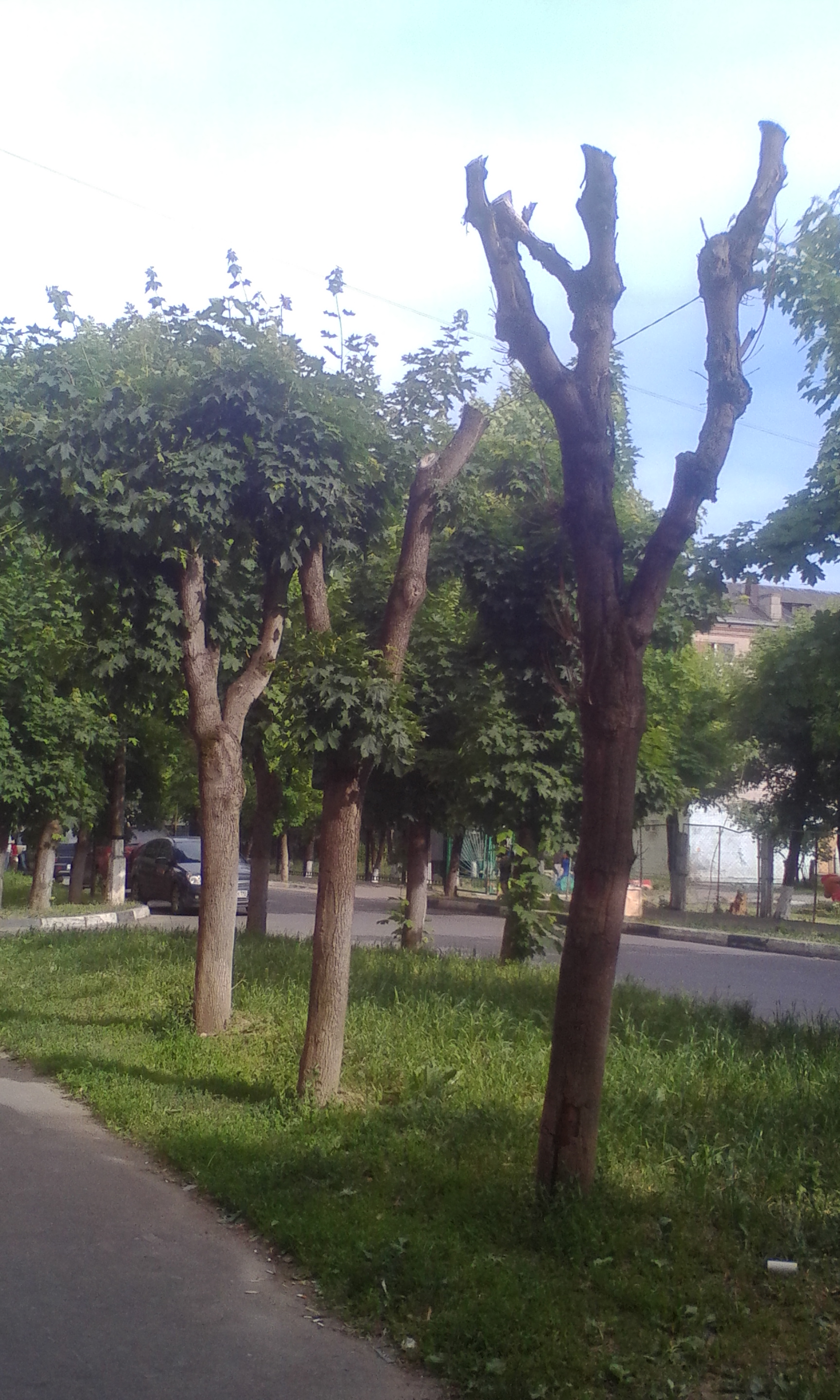 Что с ним не так? Неправильная обрезка продлевает жизнь деревьям и экономит деньги городу? При этом со стороны улицы есть старые деревья и они нормально росли и без обрезки, также как и сейчас продолжают расти обрезанные.