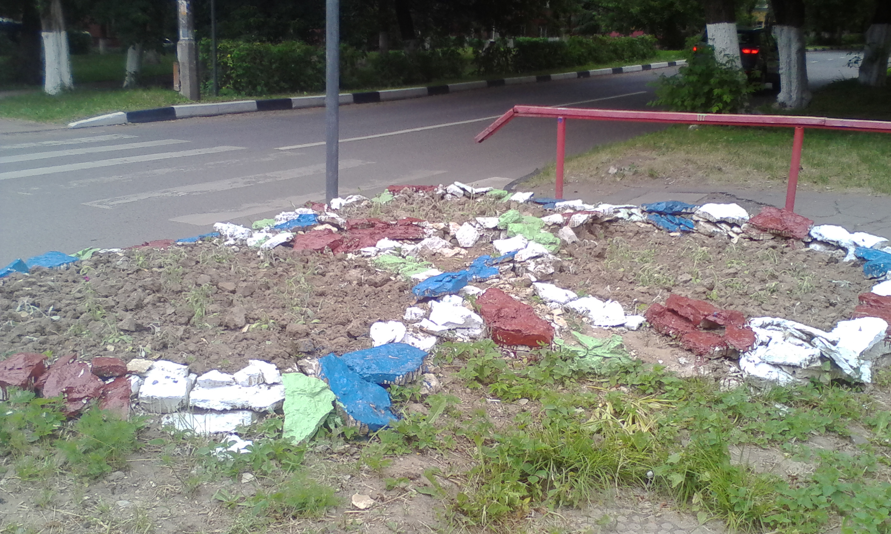 Да я даже крупный помол и не имею в виду. На фоне всех этих щепок натыканы 10 завядших цветочков. Ну не позорились бы! Уж лучше совсем ничего, чем это уродство!