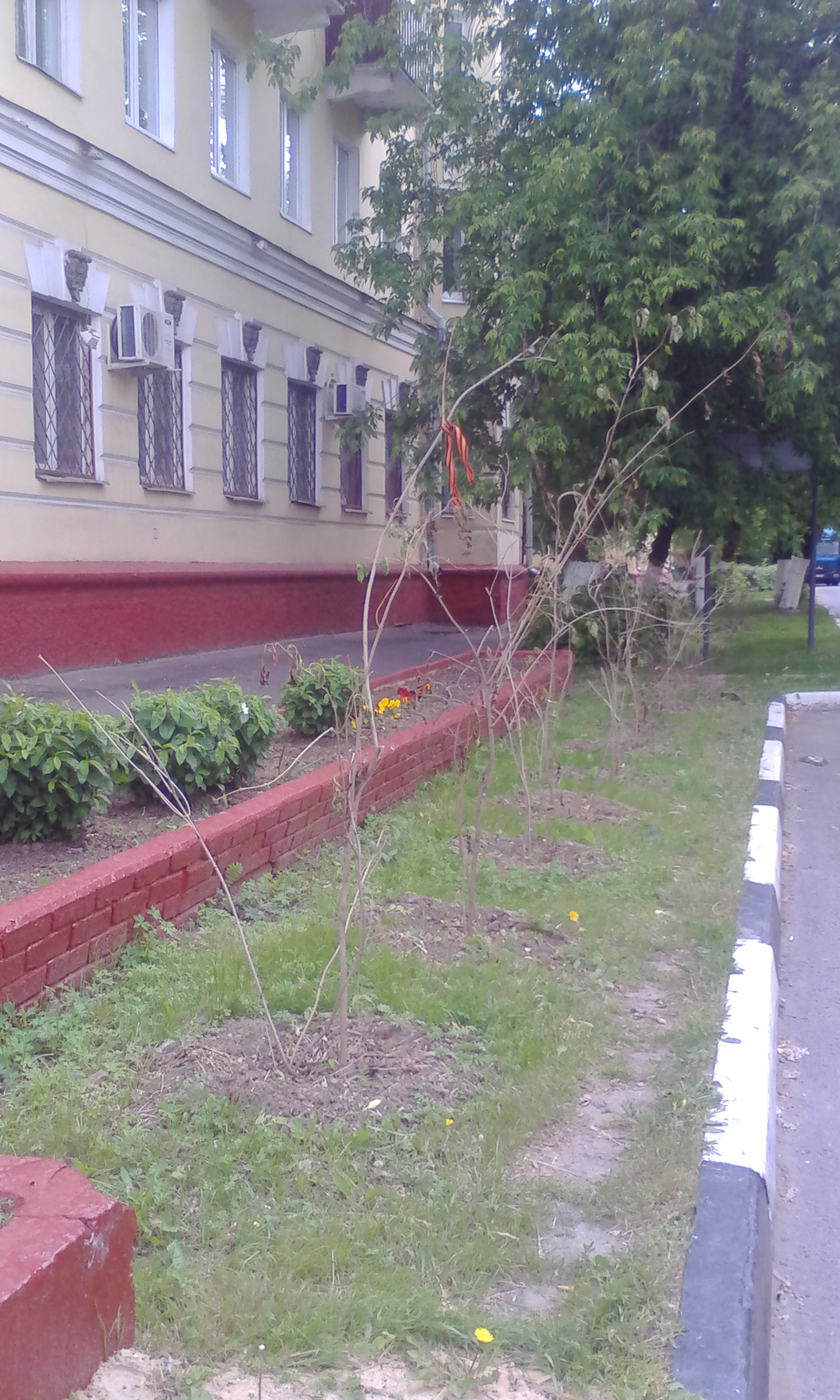 Улица Подольских курсантов - побеленные березы, лысые газоны, странные цветники, засохшая сирень Победы.